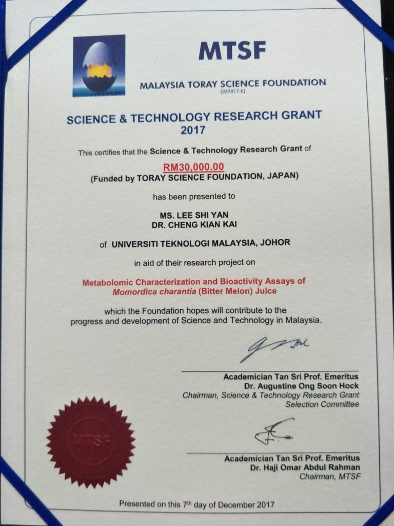 7th December 2017 – Lee Shi Yan, a Ph.D. student at from FCEE, UTM has been recently awarded an International Science & Technology Research Grant funded by Toray Science Foundation, Japan, worth RM30,000. The Prize Presentation Ceremony was held at the InterContinental Hotel, Kuala Lumpur.