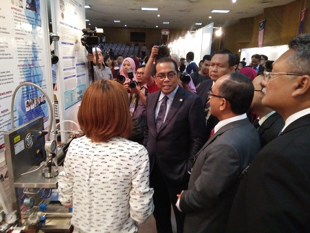 Dr. Goh explaning her research to Datuk Khaled Nordin, witnessed by Datuk Wahid Omar, UTM Vice Chancellor
