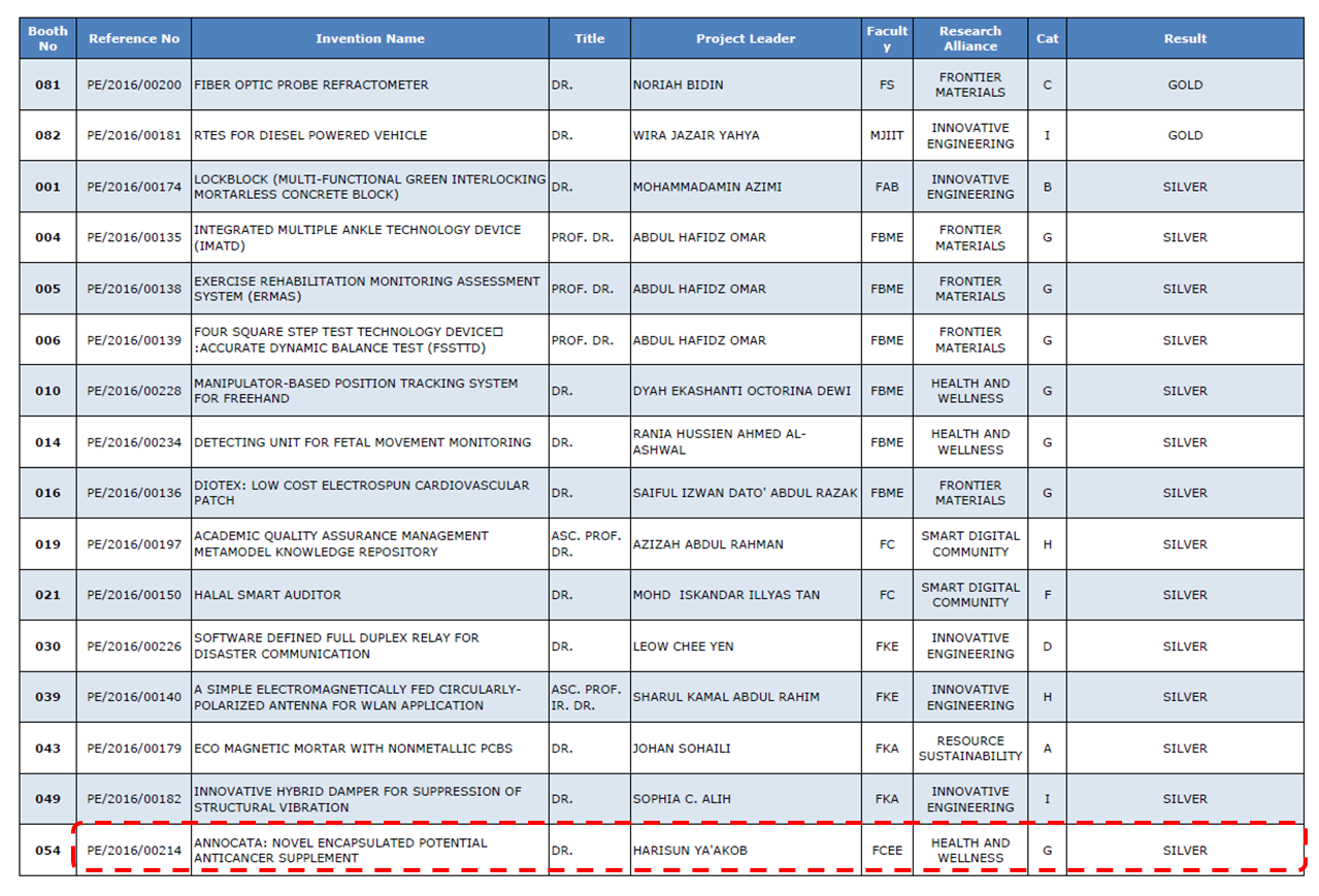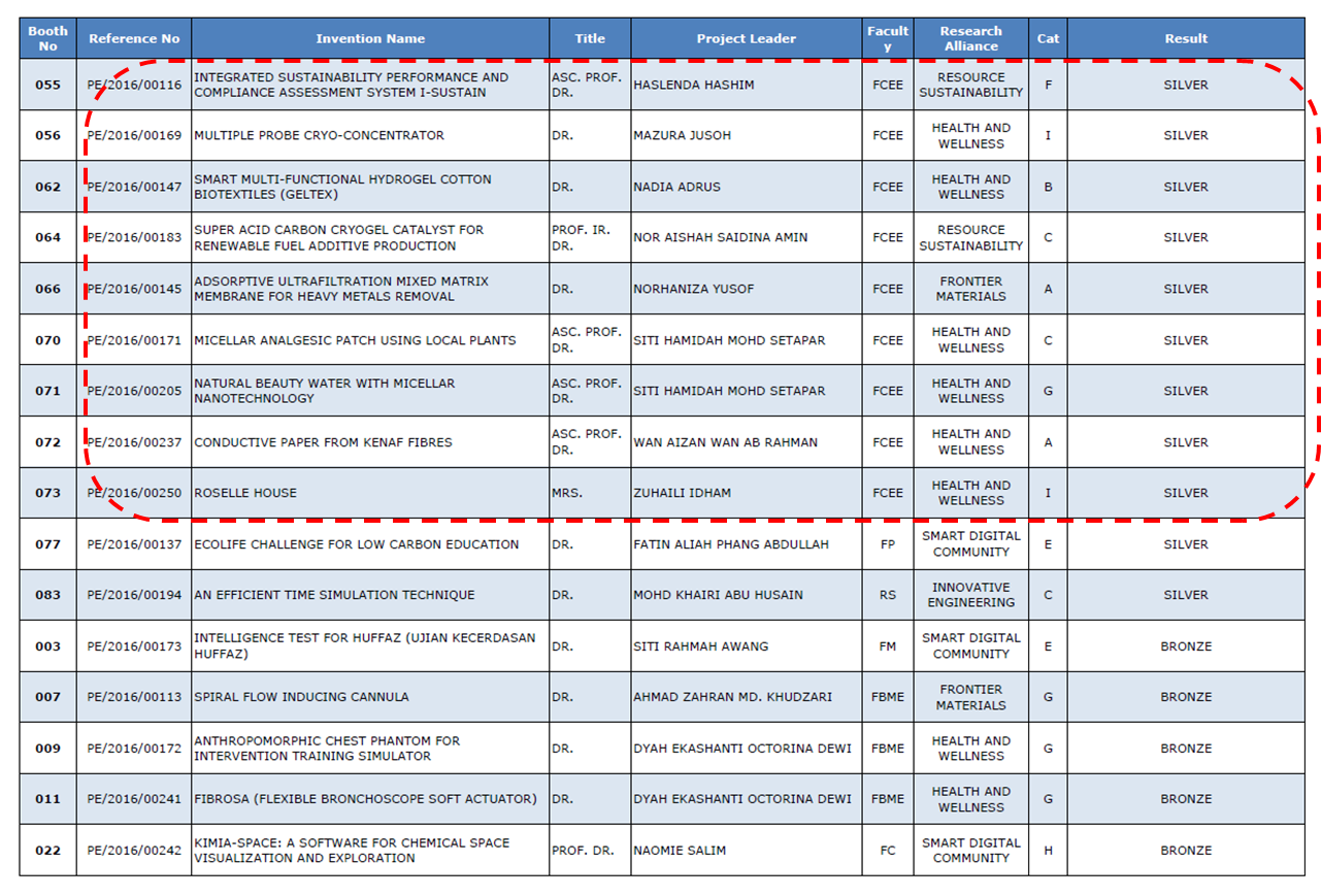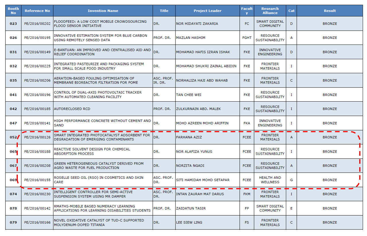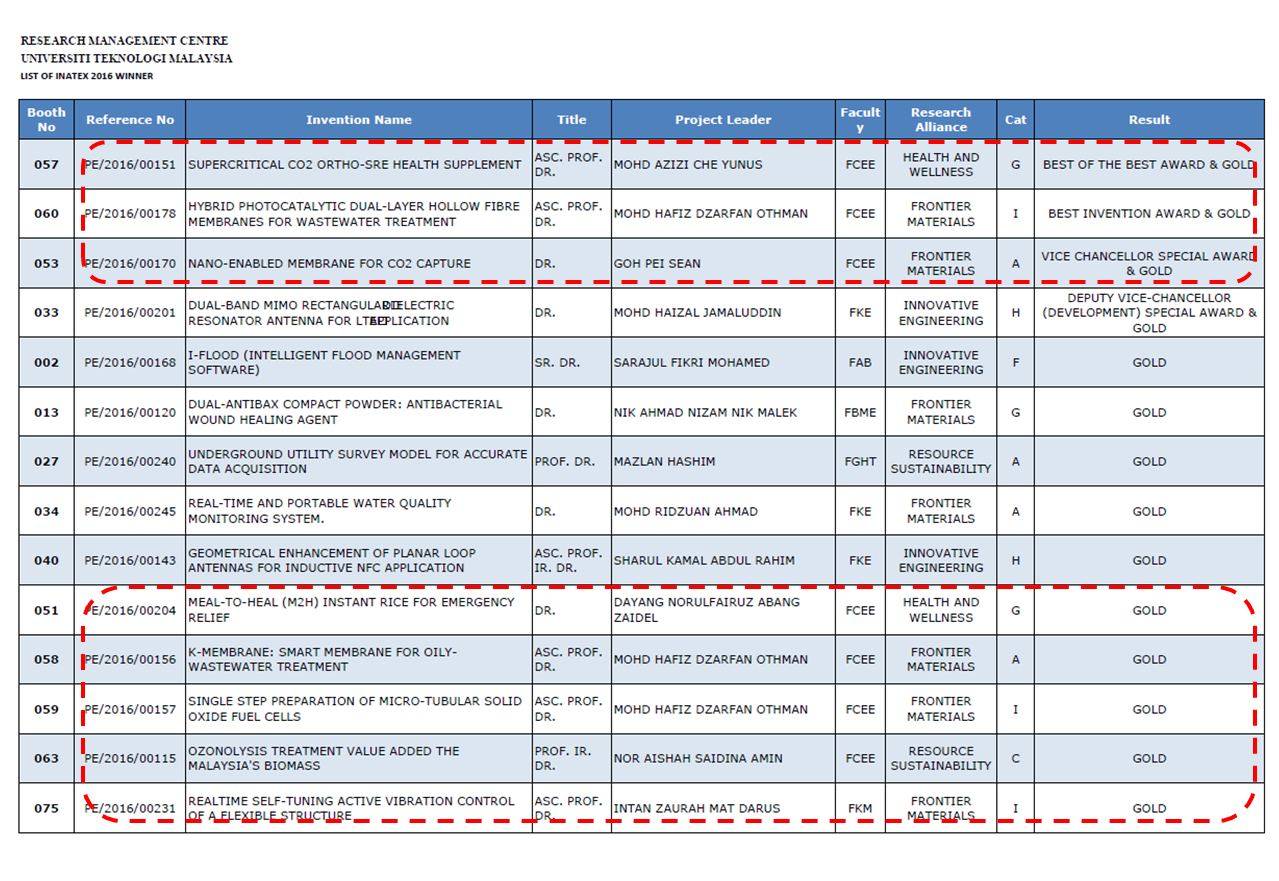 Following are the FULL RESULTS of the winners of INATEX 2016. The top 3 big winners came from FCEE. Assoc. Prof. Dr. Mohd Azizi Che Yunus won the Best of the Best Award and Gold Medal, Assoc. Prof. Dr. Mohd Hafiz Dzarfan Othman won Best Invention Award and 3 Gold Medals, whereas Dr. Goh Pei Sean won the Vice Chancellor Special Award and Gold Medal. On top of that a number of Gold, Silver and Bronze Medals have been won by FCEE researchers. Click the table below to view on bigger version.