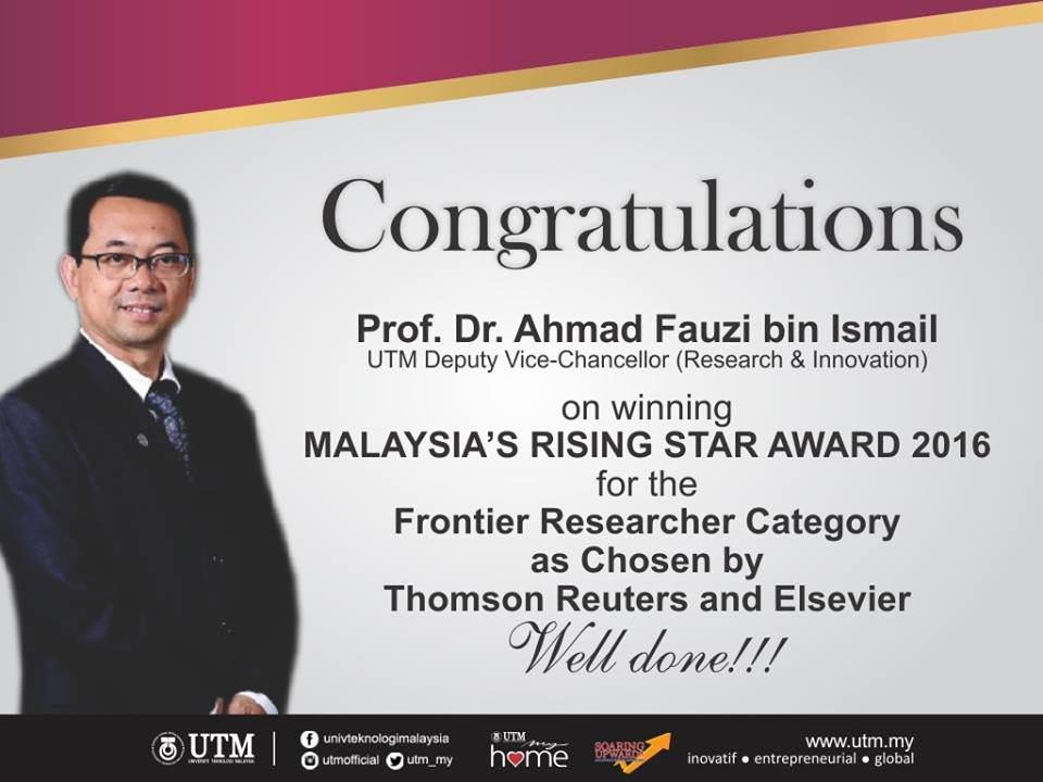 On 1st of November 2016 , twenty local scientific researchers received the Malaysia’s Rising Star Award (MRSA) today as their work are recognized as among the most frequently cited scientific researches in the world. Among that 20 local researchers, 2 of them are our very own FCEE researchers, Prof Dr. Ahmad Fauzi Ismail and Prof. Dr. Sharifah Rafidah Wan Alwi.