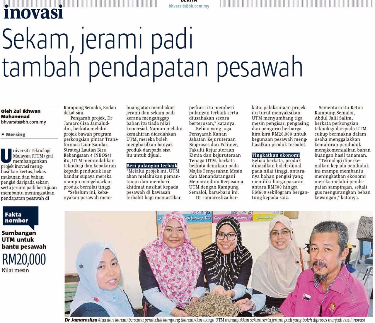 Biopolymer Research Group (BRG), Department of Bioprocess and Polymer Engineering introduced new technology which enables the paddy growers in Kampung Semaloi, Endau, Johor to convert the two agro-wastes namely, rice husk and rice straw into value-added fillers for polymer composites, paper-making and handicraft industries. Congratulations to the project leader, Dr. Jamarosliza Jamaluddin, project members, PM Dr Wan Aizan Wan Abd Rahman, Dr. Rohah Abdul Majid and Dr. Nadia Adrus, senior lecturers from the department for the impactful project.