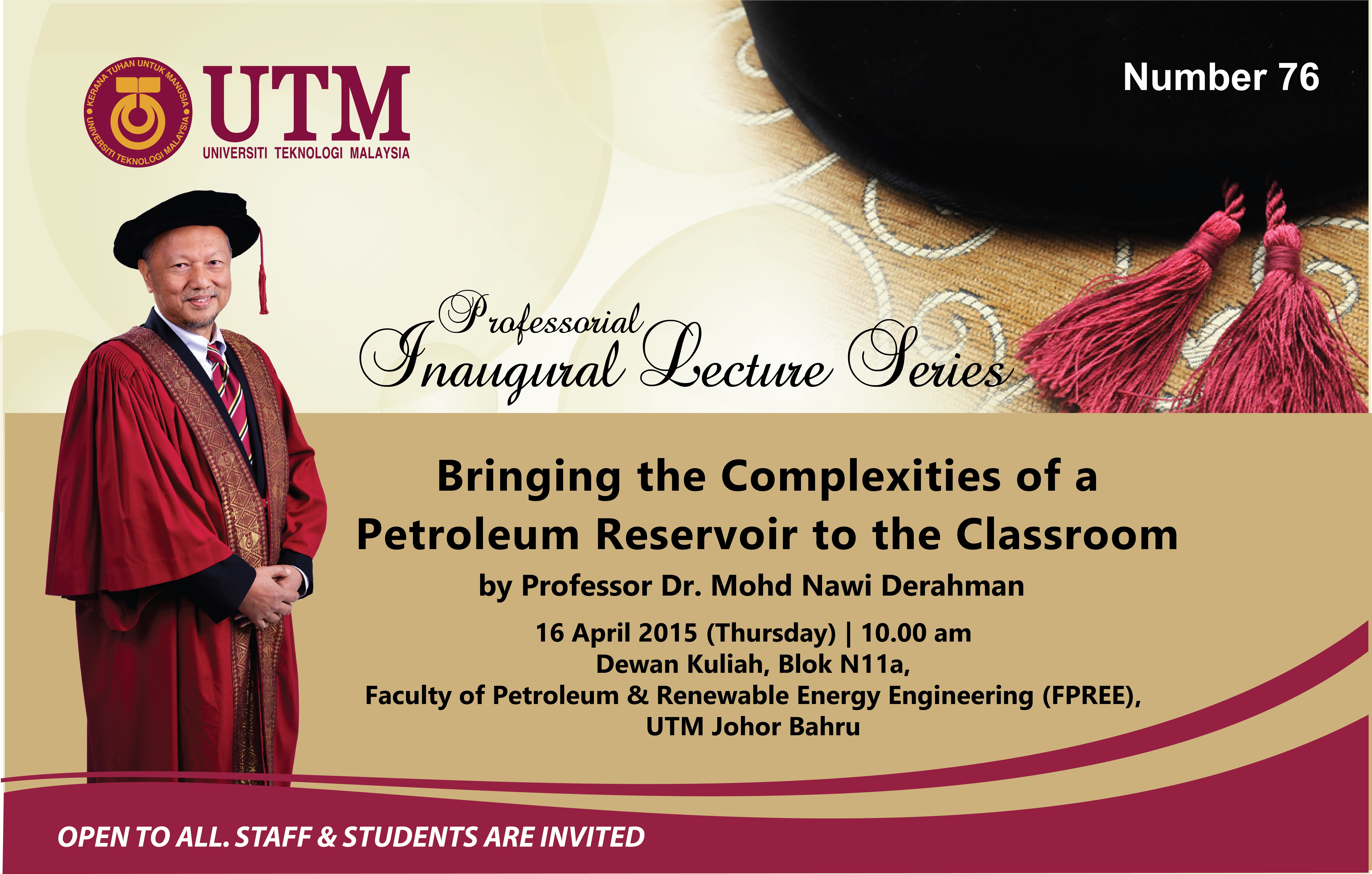 Professional Inaugural Lecture Series Prof Dr. Mohd Nawi Derahman by abkhalil | Apr 9, 2015 | Events, News Bringing the Complexities of a Petroleum Reservoir to the Classroom by Professor Dr. Mohd Nawi Derahman 16 April 2015 (Thursday) | 10.00am Dewan Kuliah, Blok N11a, Faculty of Petroleum & Renewable Energy Engineering (FPREE), UTM Johor Bahru