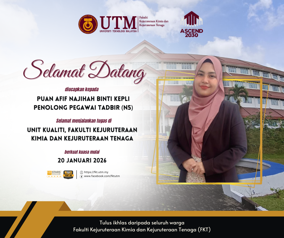 Warga Fakulti mengucapkan Selamat Datang kepada staf baharu, Puan Afif Najihah binti Kepli – Penolong Pegawai Tadbir yang telah melapor diri di Pejabat Unit Kualiti pada 20 Januari 2026.