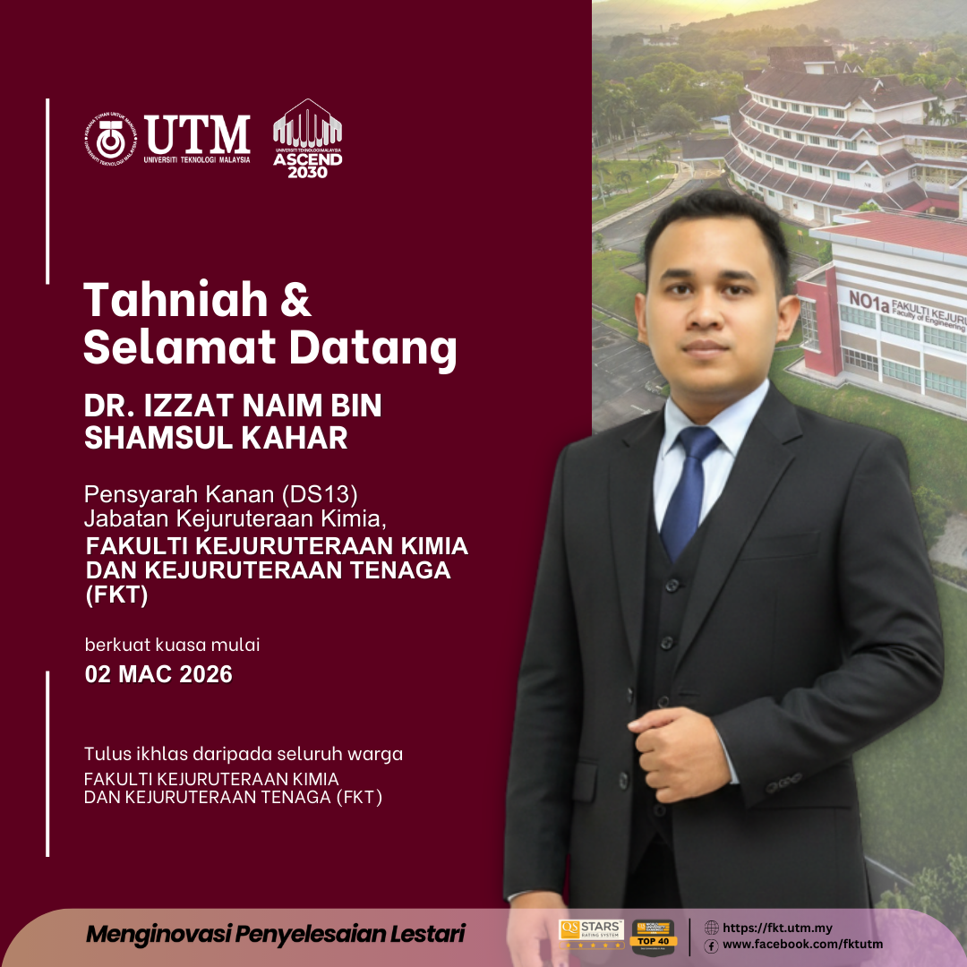 Warga Fakulti mengucapkan Selamat Datang kepada staf baharu, Dr. Izzat Naim bin Shamsul Kahar, staf akademik di Jabatan Kejuruteraan Kimia berkuat kuasa pada 02 Mac 2026.