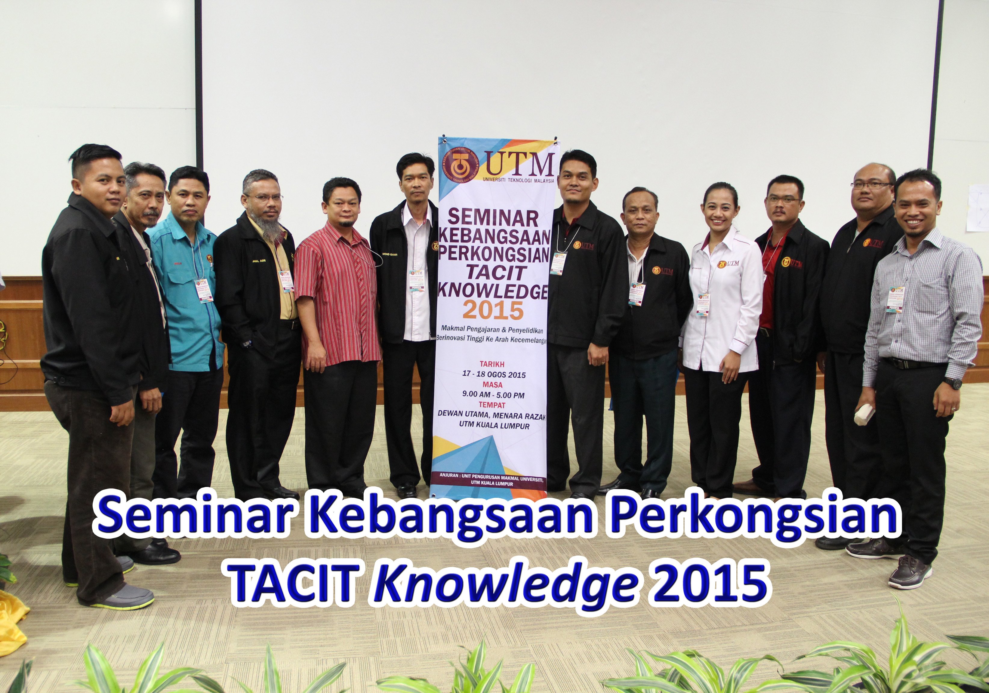 TACIT KNOWLEDGE 2015 by abkhalil | Sep 9, 2015 | News TACIT KNOWLEDGE 2015 SEMINAR PERKONGSIAN TACIT KNOWLEDGE STAF MAKMAL TAHUN 2015 (PESERTA) Tarikh : 17 & 18Ogos 2015 (Isnin &Selasa) Masa : 8.00 pagi- 5.00 petang Tempat : Bilik Seminar, Menara Razak, UTM Kuala Lumpur