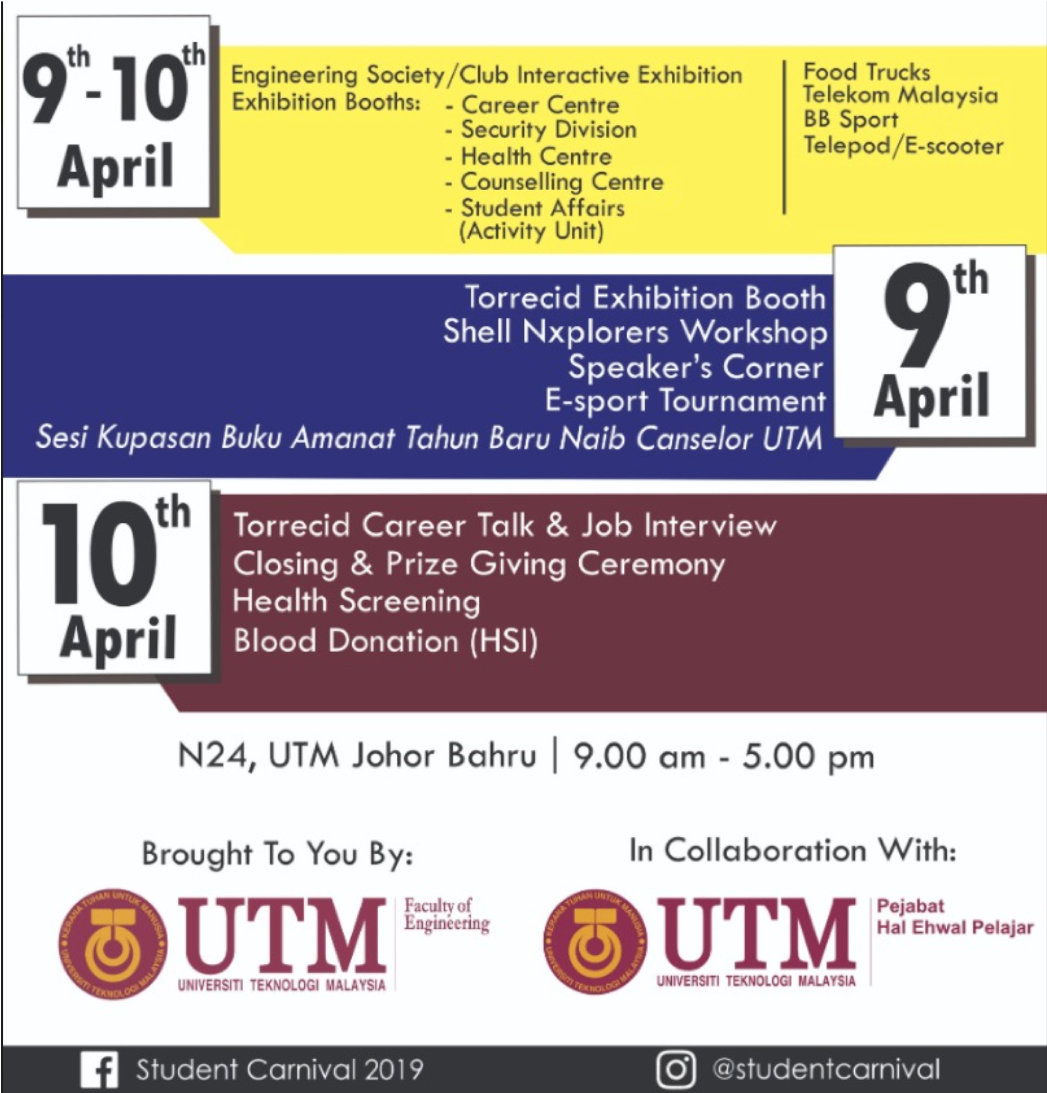 UTM Engineering Student Carnival 2019 is the first event conducted with collaboration among the engineering faculties in UTM. Engineering students are bringing closer to you to experience the fun and informative events which is going to be held at N24 on the 9th and 10th April 2019 from 9am till 5pm.
