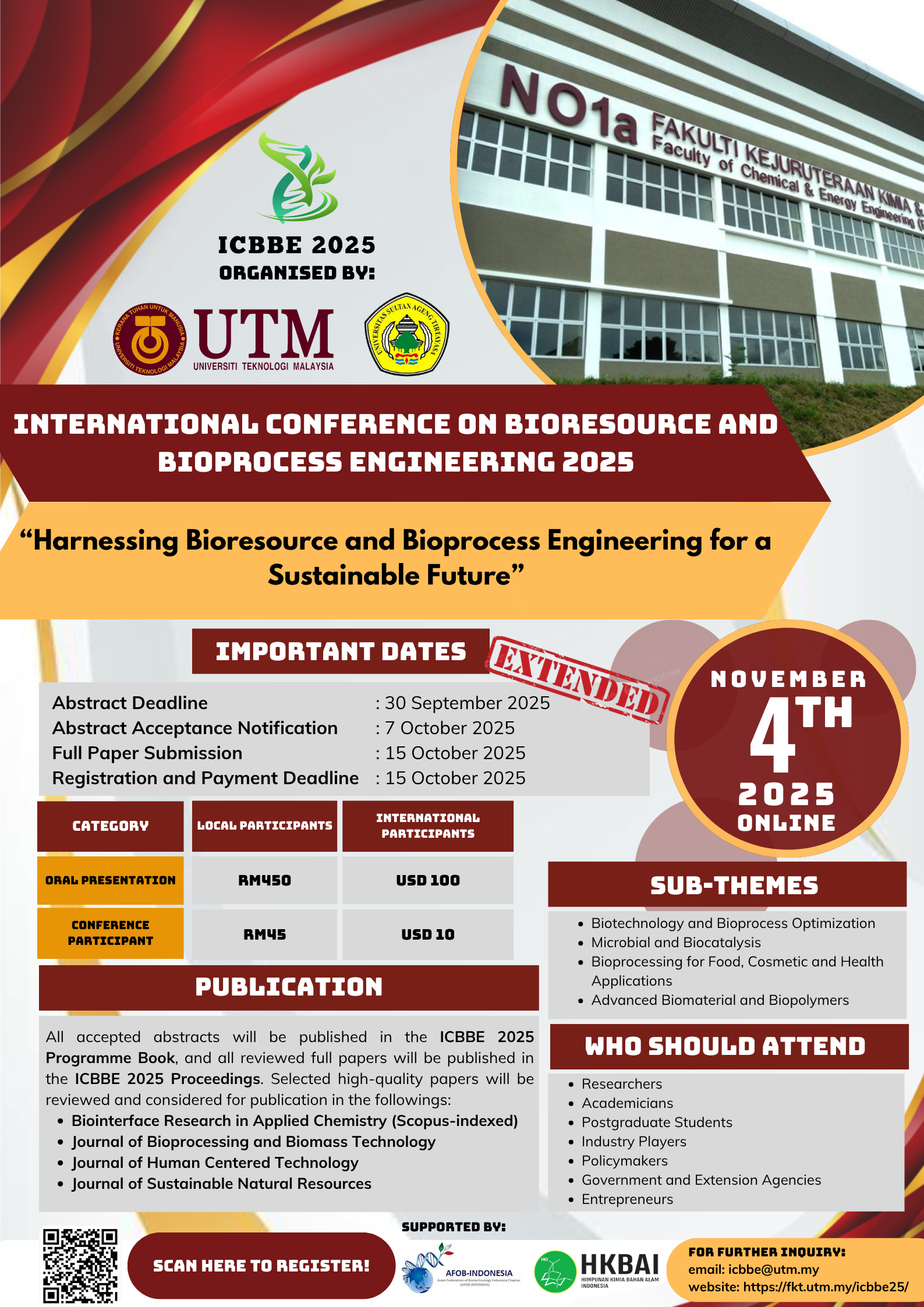 “The 1st International Conference on Bioresource and Bioprocess Engineering (ICBBE) 2025 will be held virtually on 4th November 2025. This first edition is hosted by the Department of Bioprocess and Polymer Engineering, Faculty of Chemical and Energy Engineering (FCEE), Universiti Teknologi Malaysia (UTM), in collaboration with Universitas Sultan Ageng Tirtayasa (UNTIRTA), Indonesia. ICBBE 2025 aims to become a leading platform for discussing the utilization and advancement of natural resources and bioprocess engineering in driving innovative solutions for societal well-being. The conference brings together researchers, academics, government representatives, and industry professionals to exchange ideas, foster collaboration, and explore the role of bioresource and bioprocess technologies in addressing global challenges and enhancing quality of life.”