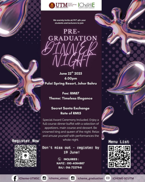 On the evening of June 22nd, 2025, the halls of Pulai Spring Resort, Johor Bahru shimmered with grace and glamour as IChemE UTM-SC proudly hosted its much-anticipated Pre-Graduation Dinner Night under the enchanting theme: “Timeless Elegance.”