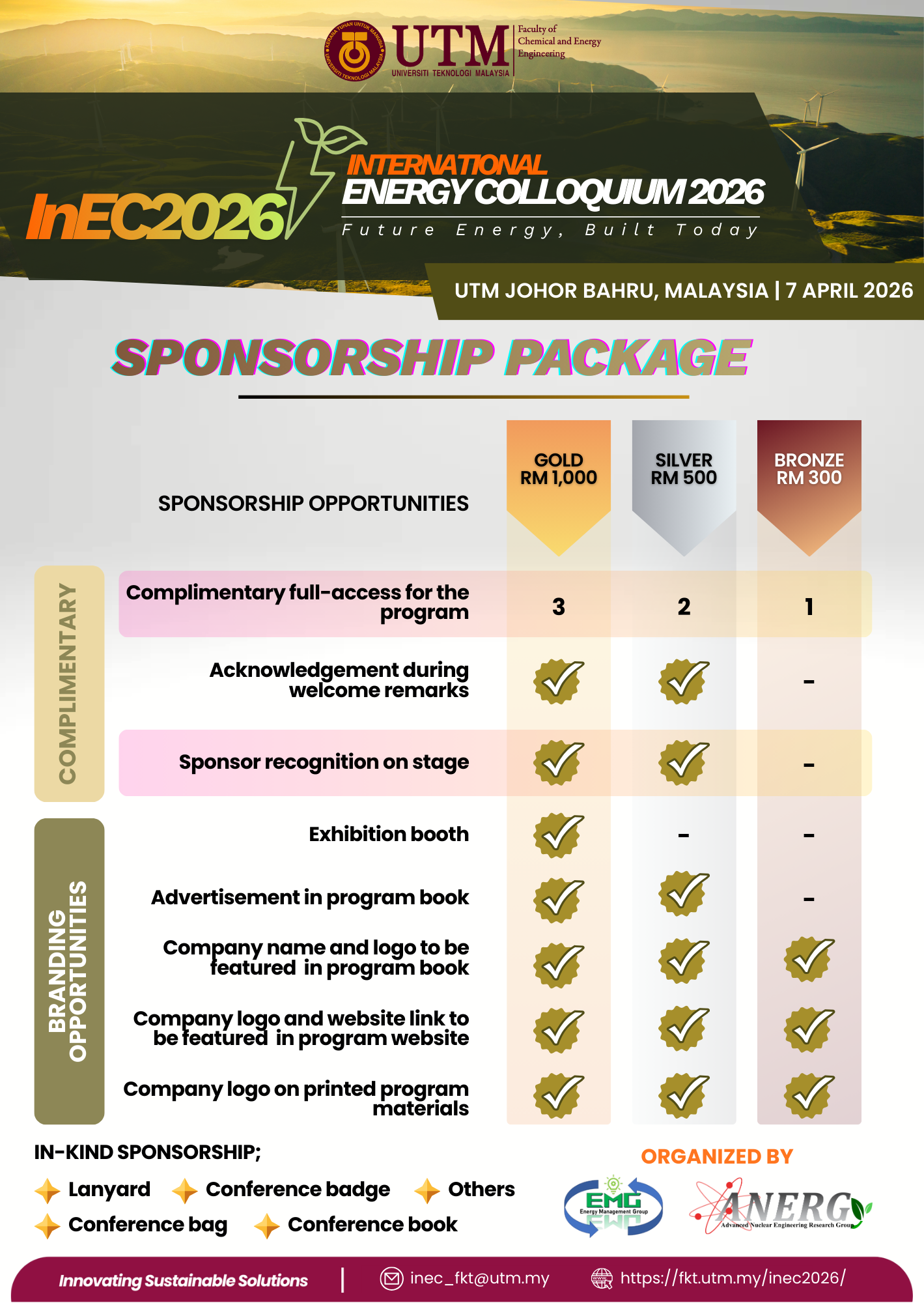 The International Energy Colloquium 2026 (InEC 2026) is the inaugural event of its kind at the Faculty of Chemical Engineering and Energy Engineering (FKT), Universiti Teknologi Malaysia (UTM). Jointly organised by the Energy Management Group (EMG) and the Advanced Nuclear Engineering Research Group (ANERGY) , the colloquium will take place on April 7, 2026, at N24, UTM. It is designed as a hybrid event, accommodating both physical and virtual participation from students.