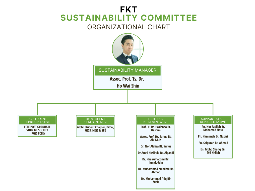 The FKT Sustainability Committee is a dynamic team of passionate individuals dedicated to promoting and implementing sustainable practices within our faculty. Spearheaded by Assoc. Prof. Ts. Dr. Ho Wai Shin, the committee brings together representatives from postgraduate and undergraduate student bodies, academic staff, and support staff to collaboratively shape a more eco-conscious academic environment.